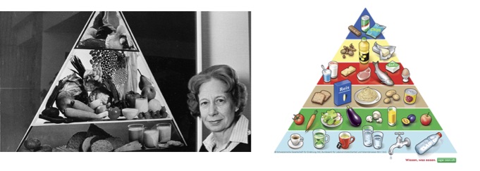 In der Schweiz kennt jeder die Lebensmittelpyramide neben der Regel „5 Früchte am Tag“. Prinzip der ersten Lebensmittelpyramide[3] war eine gute, gesunde Kost zu einem annehmbaren Preis (Abb.1, links). Sie enthielt lediglich 3 Stufen und damit 3 Stufen weniger verglichen mit den sechs, die wir heute in der Schweizer Ernährungspyramide[4] finden (Abb.1, rechts). Grundnahrungsmittel bildeten die 1.Stufe (Cerealien, Milchprodukte, Pasta und Kartoffeln). Ergänzende Lebensmittel, die der Vitamin- und Mineralstoffzulieferung dienten, wie Früchte und Gemüse waren die 2. Stufe. Fisch, Fleisch und Eier auf 3. Stufe gab es nur an besonderen Anlässen[5]. In den 70 Jahren waren verarbeitete Produkte und Produkte mit zugesetztem Zucker noch nicht Teil der täglichen Kost. Auch Öle und Fette wurden nicht aufgeführt.