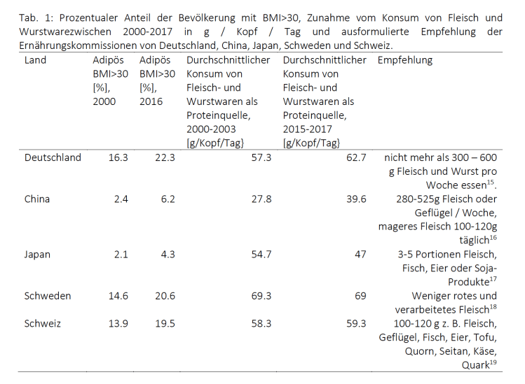 Tabelle 1. Prozentualer Anteil der Bevölkerung mit BMI>30, Zunahme der Versorgung von tierischen Produkten zwischen 2000-2017 in g / Kopf / Tag und ausformulierte Empfehlung der Ernährungskommissionen von Deutschland, China, Japan, Schweden und Schweiz.