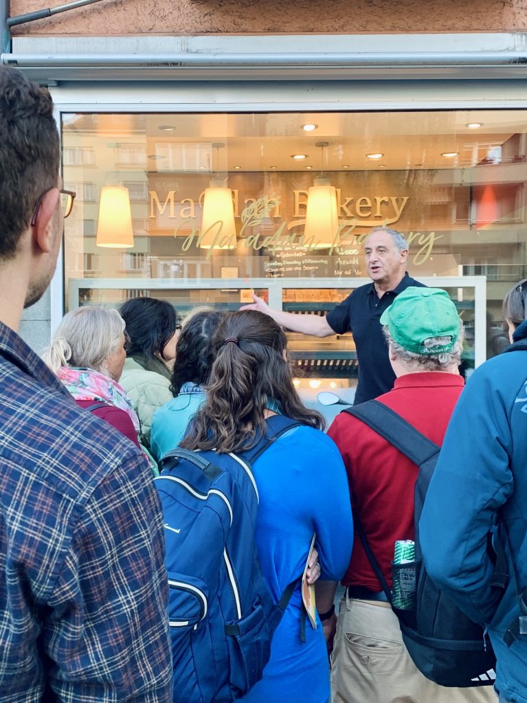 Die Besuche der jüdischen Bäckerei Ma’adan, des Mitgliederladens Rampe 5 und des Madame Frigo Kühlschranks an der Kalkbreite erweiterten das Wissen über das vielfältige Einkaufsangebot und die verschiedenen Formen von Lebensmittelkooperationen (POT Netzwerk), während die Verkostung lokaler Produkte das Erlebnis abrundete (z.B. von köstlichen schweizer Haselnüssen). Vor allem die Geschichten der Betreiber:innen und die Präsentation der Lebensmittel inspirierten die Teilnehmer:innen, sich auf neue Wege beim Einkaufen einzulassen und ihre Gewohnheiten zu überdenken.