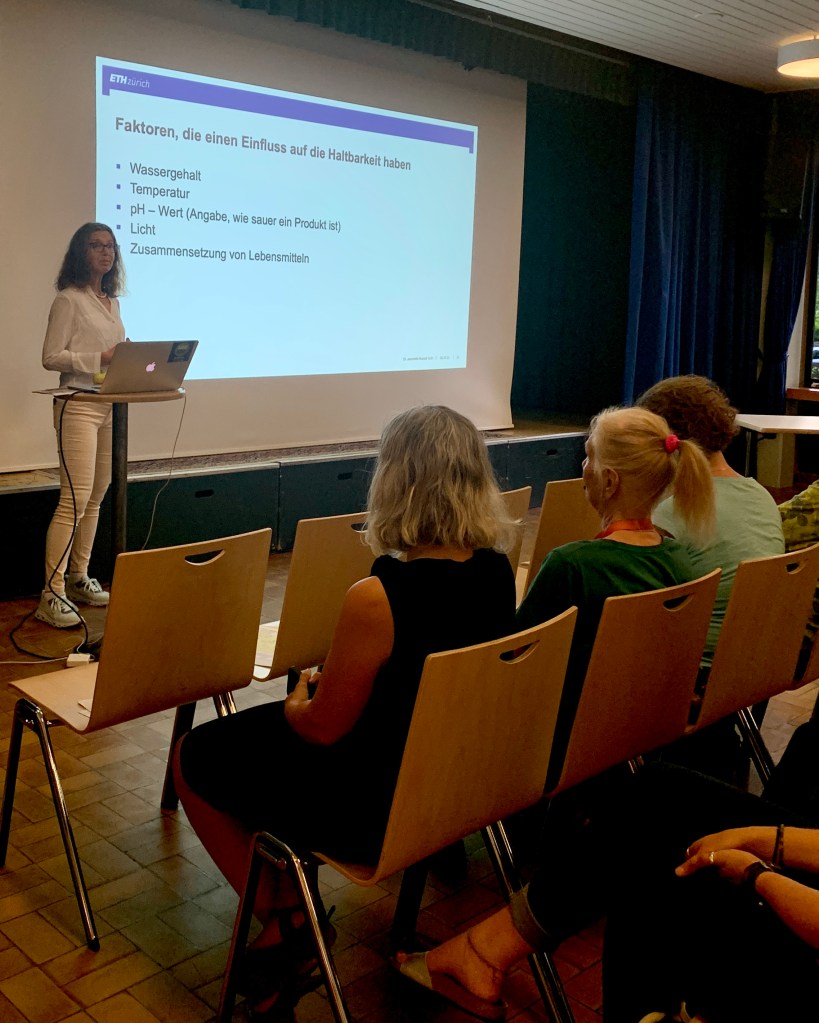 Beim letzten Posten mussten Lebensmittel der Reihe nach eingeordnet werden (Bild 1). Es wurde viel diskutiert: Beheizte Gewächshäuser in der Schweiz erzeugen mehr CO2-eq. als LKW-Transporte von Gemüse und Obst aus Spanien. Deshalb ist es so wichtig auf die Saisonalität zu achten.