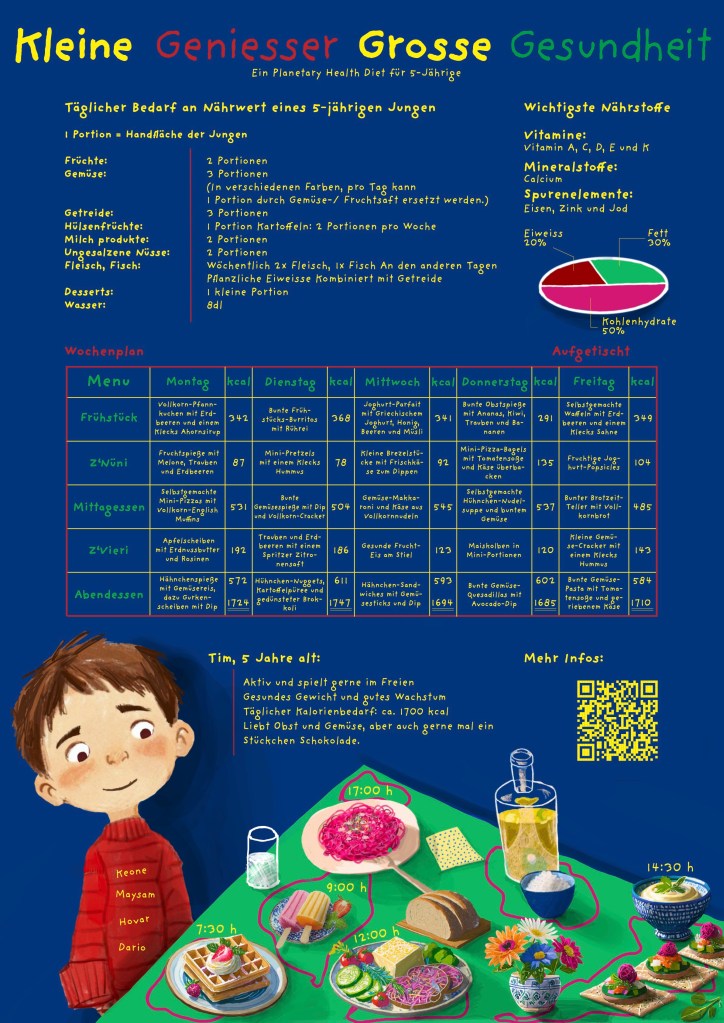 Tim ist 5 Jahre alt und liebt es, draußen zu spielen und die Natur zu erkunden. Um gut zu wachsen, benötigt er etwa 1700 kcal pro Tag. Mit seinem Speiseplan, der reich an frischem Obst und Gemüse ist, kann er die Prinzipien der PHD gut umsetzen. Ab und zu geniesst er auch ein Stück Schokolade, was seine ausgewogene Ernährung perfekt abrundet. Von Keane, Maysam, Hovar und Dario.