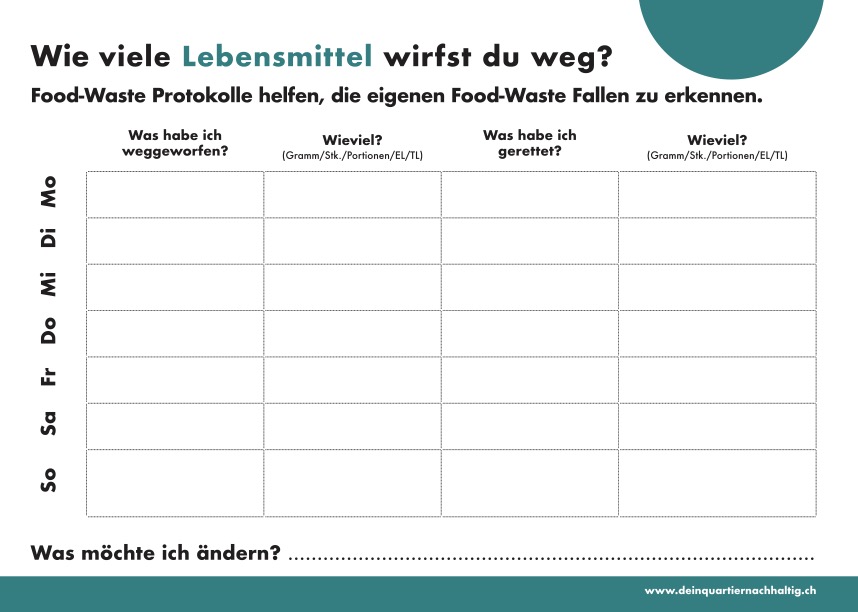 Wie viele Lebensmittel landen bei dir im Haushaltsmüll? Mit dem Food Waste Protokoll notierst du welche Lebensmittel an welchem Tag weggeworfen werden. Ist es das Brot am Montagabend? Oder die Tomaten am Mittag? Das Protokoll hilft, eigenen Food Waste Fallen zu erkennen und Lösungen zu finden.