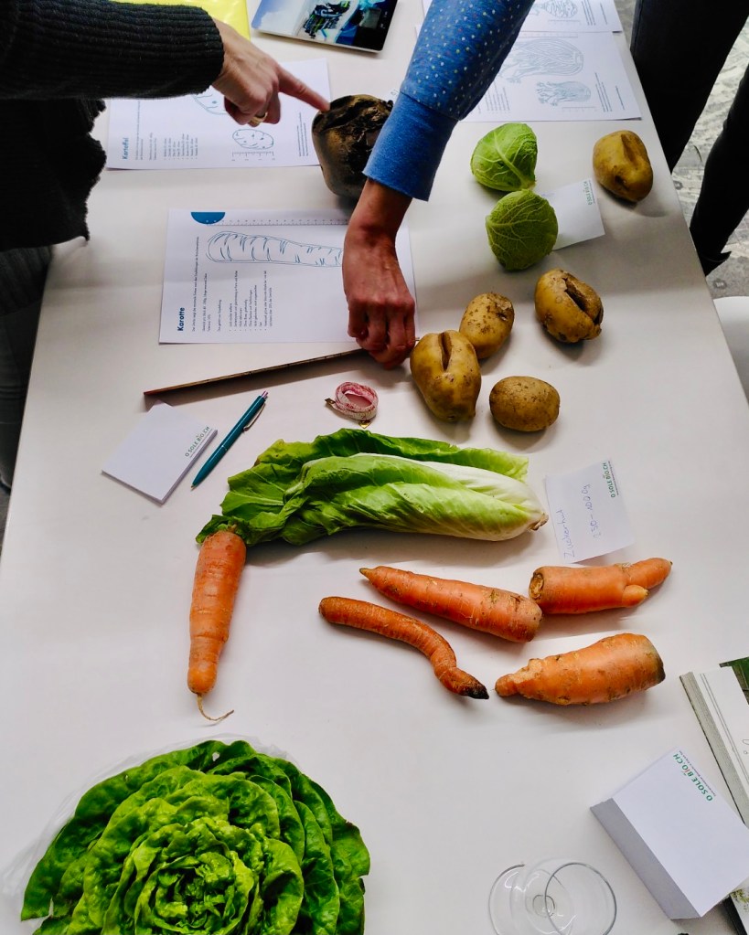Astrid von Bio Luzern brachte Gemüse vom Bio-Hof mit. Gemüse entspricht oft nicht der Norm und den schweizerischen Qualitätsbestimmungen für Gemüse. Die Karotten sind zu gross oder zwei geteilt, die Randen zu klein und die Kartoffeln haben zu tiefe Risse. Das Gemüse konnte bei Astrid geprüft werden. Gewicht und Grösse sind bei den Stichprobenkontrollen ausschlaggenbend. Vieles wird aussortiert und nicht vom Detailhandel akzeptiert. Lerne die Normen kennen und messe nach.