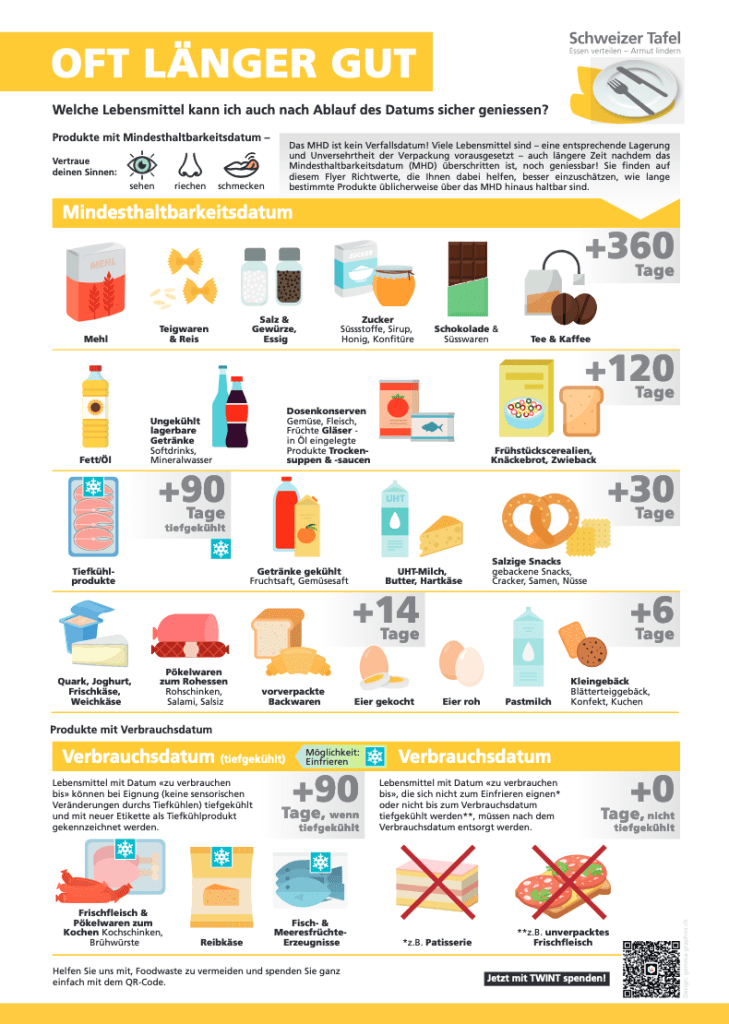 Wie viele Tage länger können wir Lebensmittel noch essen? Leaflet der Schweizer Tafel